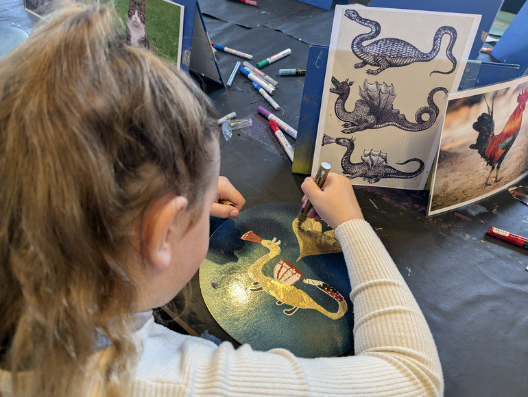 Einmal im Jahr verbringen 4.-Klässler:innen der Grundschule Hanoierstraße einen gemeinsamen Tag mit 8.-Klässler:innen des Elisabethgymnasiums. Das Programm des Tages ist bunt, kreativ und vollgepackt. Nach einem gemeinsamen Frühstück wurden in vier Workshops des Kinderkunst Forums Ausstellungsexponate gefertigt. Es entstanden Himmelsscheiben, Rosenkränze und Lampen aus Fahrradfelgen. Die Exponate wanderten danach direkt ins Elisabethgymnasium, wo sie als Ausstellung für den Tag der offenen Tür aufgebaut wurden. Die Ergebnisse des vierten Workshops waren kulinarischer Art und wurden direkt vor Ort zur Ausstellungseröffnung aufgegessen. Neben den Kunsttechniken ist der Tag wertvoll, um gegenseitige Vorurteile abzubauen und den Grundschulkindern ein Gymnasium als mögliche weiterführende Schule vorzustellen. Im nächsten Jahr soll sich das Elisabethgymnasium auch auf dem Elternabend der Grundschule präsentieren